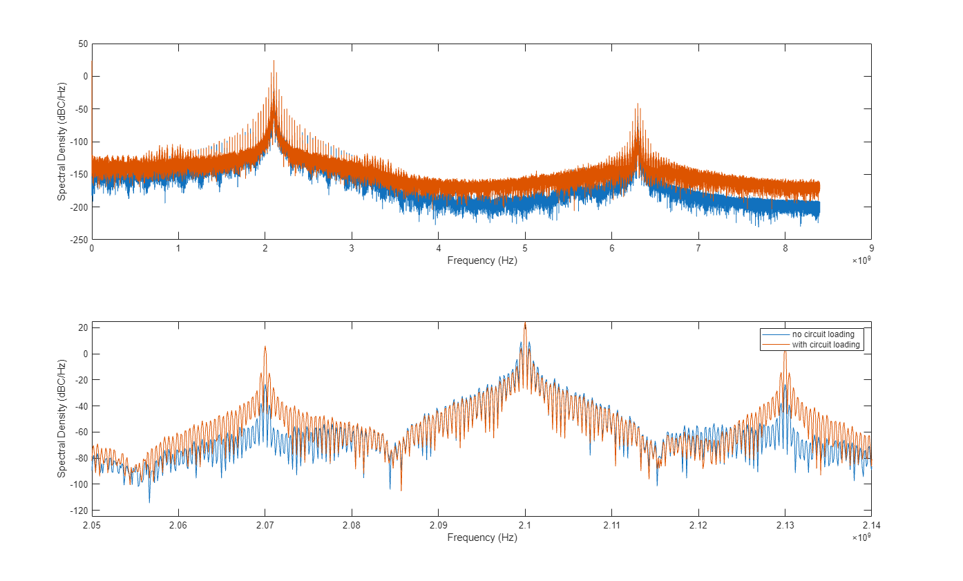 Plot the PLL output spectrum using the plotPllOutputSpectrum helper script. The primary impact of the circuit loading is a substantial increase in the spurious responses.