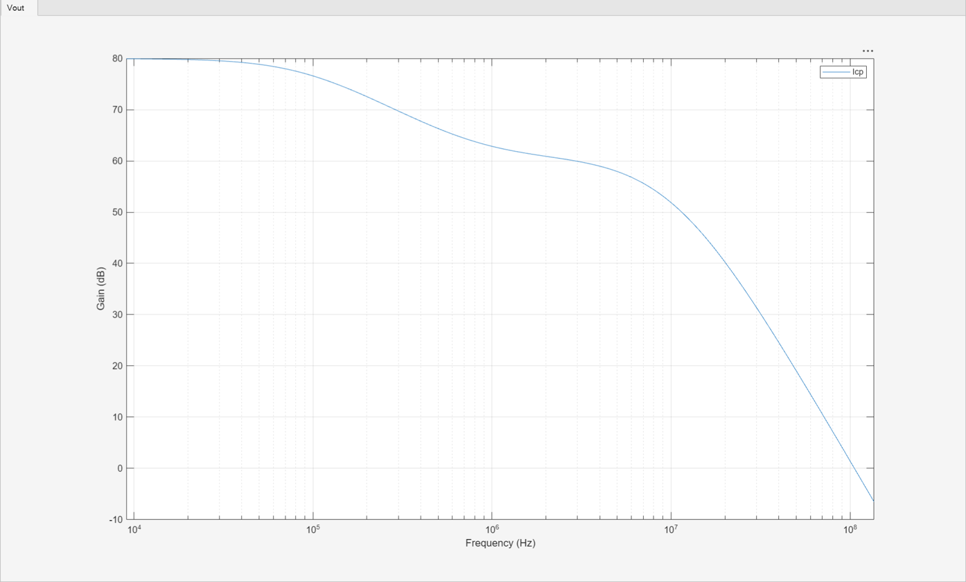 To create the loop filter block, start by creating or obtaining a Simscape™ schematic of the circuit. This example uses a third order passive loop filter defined in ThirdOrderPassiveLoopFilter.slx. This schematic includes the independent current source Icp to define a current input port and the voltage output port Vout.