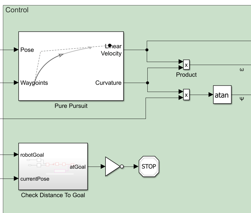 To guide the vehicle along the specified waypoints, the Pure Pursuit block generates steering commands. It receives the current vehicle Pose and the sequence of Waypoints as inputs, and outputs the Linear Velocity and path Curvature.