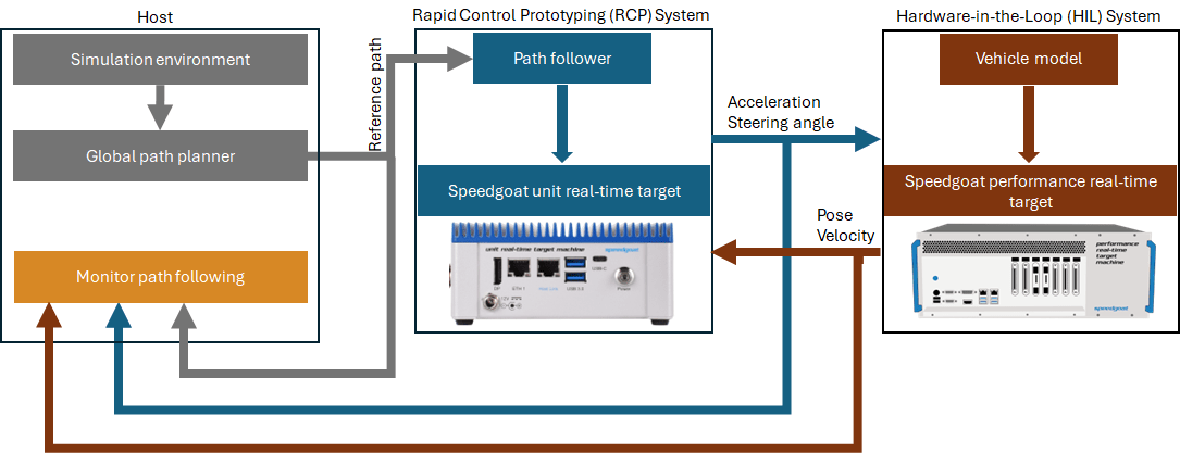 Sistema Hardware-in-the-Loop: este sistema implementa el modelo de Simulink® para representar la dinámica del vehículo en una plataforma objetivo en tiempo real de la unidad Speedgoat para simular la respuesta del vehículo. El sistema HIL recibe los ángulos de dirección y los comandos de aceleración como entradas del sistema RCP y simula la maniobra del vehículo. El sistema envía información sobre el estado actual del vehículo, incluida la posición y la velocidad, al sistema RCP para su validación y corrección de errores. Al comparar el estado actual del vehículo con la trayectoria deseada, el sistema RCP calcula errores de posición y rumbo, ajustando los comandos de dirección y aceleración en consecuencia. Esto garantiza que el vehículo permanezca en el rumbo, adaptándose dinámicamente a los cambios de velocidad o dirección y manejando eficazmente cualquier desviación de la trayectoria para una navegación fluida y precisa.