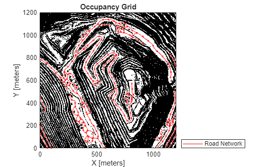 figure show(map) hold on scatter(T.nodes(:,1),T.nodes(:,2),5,"o","r") pathIds = unique(T.cachedPaths(:,1)) ; for i=1:length(pathIds) id = find(pathIds(i)==T.cachedPaths(:,1)); h = plot(T.cachedPaths(id,2),T.cachedPaths(id,3),"r"); end legend(h,"Road Network",Location="southeastoutside")