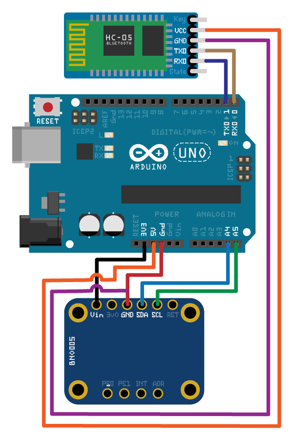 Conecte los pines SDA, SCL, GND y VCC del sensor BNO055 a los pines correspondientes en la placa Arduino Uno con las conexiones: