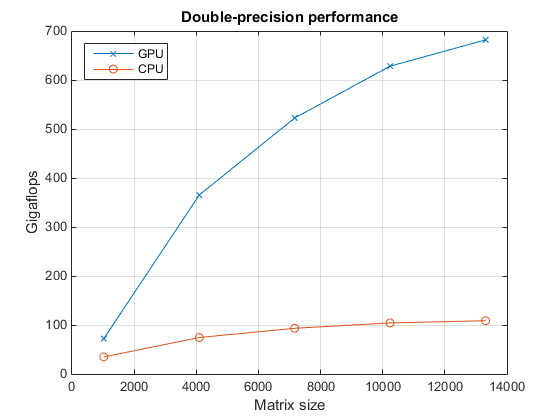 fig = figure; ax = axes('parent', fig); plot(ax, results.sizeDouble, results.gflopsDoubleGPU, '-x', ... results.sizeDouble, results.gflopsDoubleCPU, '-o') legend('GPU', 'CPU', 'Location', 'NorthWest'); grid on; title(ax, 'Double-precision performance') ylabel(ax, 'Gigaflops'); xlabel(ax, 'Matrix size'); drawnow;