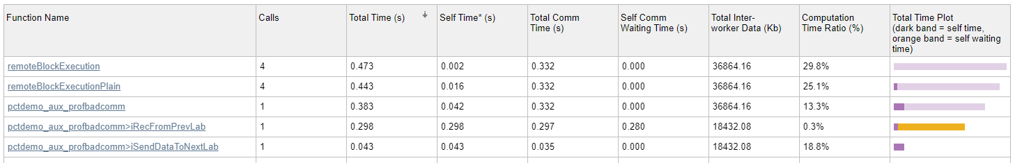 1. View the Parallel Profile Summary table and click the Max vs. Min Total Time button in the Compare section of the toolstrip. Observe the large orange waiting time indicated for the pctdemo_aux_profbadcomm>iRecFromPrevLab entry. This is an early indication that there is something wrong with a corresponding send, either because of network problems or algorithm problems.