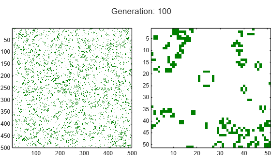 currentGrid = initialGrid; numGenerations = 100; figure t = tiledlayout(1,2,TileSpacing="compact",Padding="tight"); gridAx = nexttile; colormap([1 1 1;0 0.5 0]); im = imagesc(gridAx,currentGrid); axis square zoomedAx = nexttile; zoomedIm = imagesc(zoomedAx,currentGrid(50:100,50:100)); colormap([1 1 1;0 0.5 0]); axis square % Loop through each generation updating the grid and displaying it for generation = 1:numGenerations currentGrid = updateGrid(currentGrid,gridSize); im.CData = currentGrid; zoomedIm.CData = currentGrid(50:100,50:100); title(t,"Generation: " + generation) drawnow pause(0.2) end