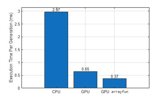 figure b = bar( ["CPU" "GPU" "GPU \fontname{monospace}arrayfun"], ... [1000*cpuTime/numGenerations 1000*gpuSimpleTime/numGenerations 1000*gpuArrayfunTime/numGenerations]); ylabel("Execution Time Per Generation (ms)") grid on b(1).Labels = round(b(1).YData,2);