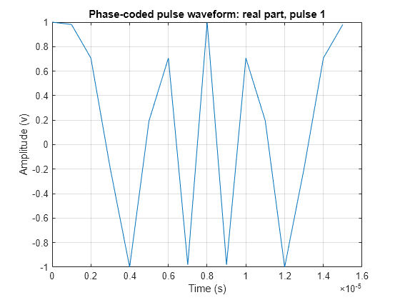 Figure contains an axes object. The axes object with title Phase-coded pulse waveform: real part, pulse 1, xlabel Time (s), ylabel Amplitude (v) contains an object of type line.