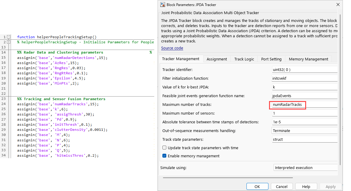 Some of the parameter values in the JPDA Tracker block are already defined using the helperPeopleTrackingSetup helper function. Change the values, if required.