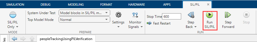 You can use the SIL/PIL Manager app in Simulink Editor that provides a simplified workflow for verifying generated model code (in the Apps tab, click SIL/PIL Manager). The SIL/PIL tab displays the Run section. To run PIL simulation: