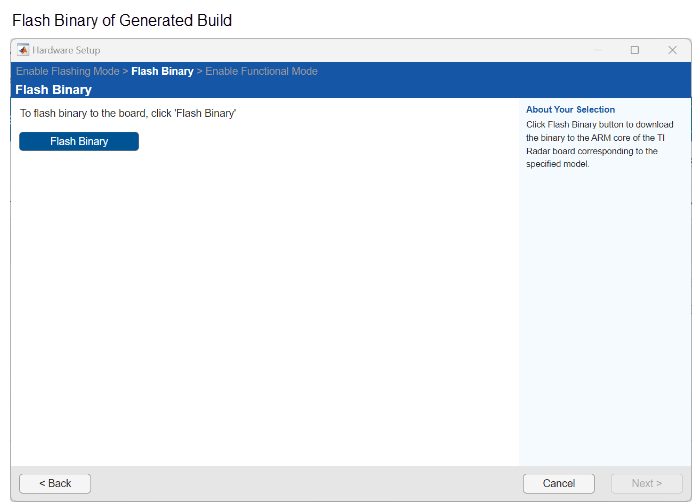 The process also involves changing the switch positions on the connected TI mmWave board and flashing the binary file. The Hardware Setup window that is launched automatically guides you though the process of flashing the binary file on the target hardware. The hardware setup windows follows this sequence: Enable Flashing Mode ----> Flash Binary ----> Enable Functional Mode.