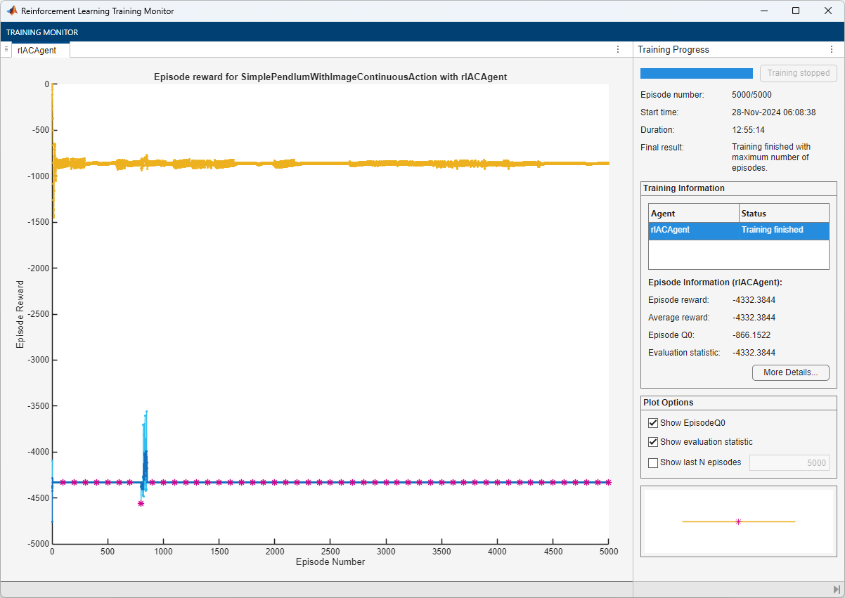 % Recreate the environment so it does not plot during training. env = rlPredefinedEnv("SimplePendulumWithImage-Continuous"); % Train the agent. Record the training time. tic acTngRes = train(acAgent,env,trainOpts,Evaluator=evl); acTngTime = toc; % Extract the number of training episodes and the number of total steps. acTngEps = acTngRes.EpisodeIndex(end); acTngSteps = sum(acTngRes.TotalAgentSteps); % Uncomment to save the trained agent and the training metrics. % save("cpsuImgBchACData.mat", ... % "acAgent","acTngEps","acTngSteps","acTngTime")