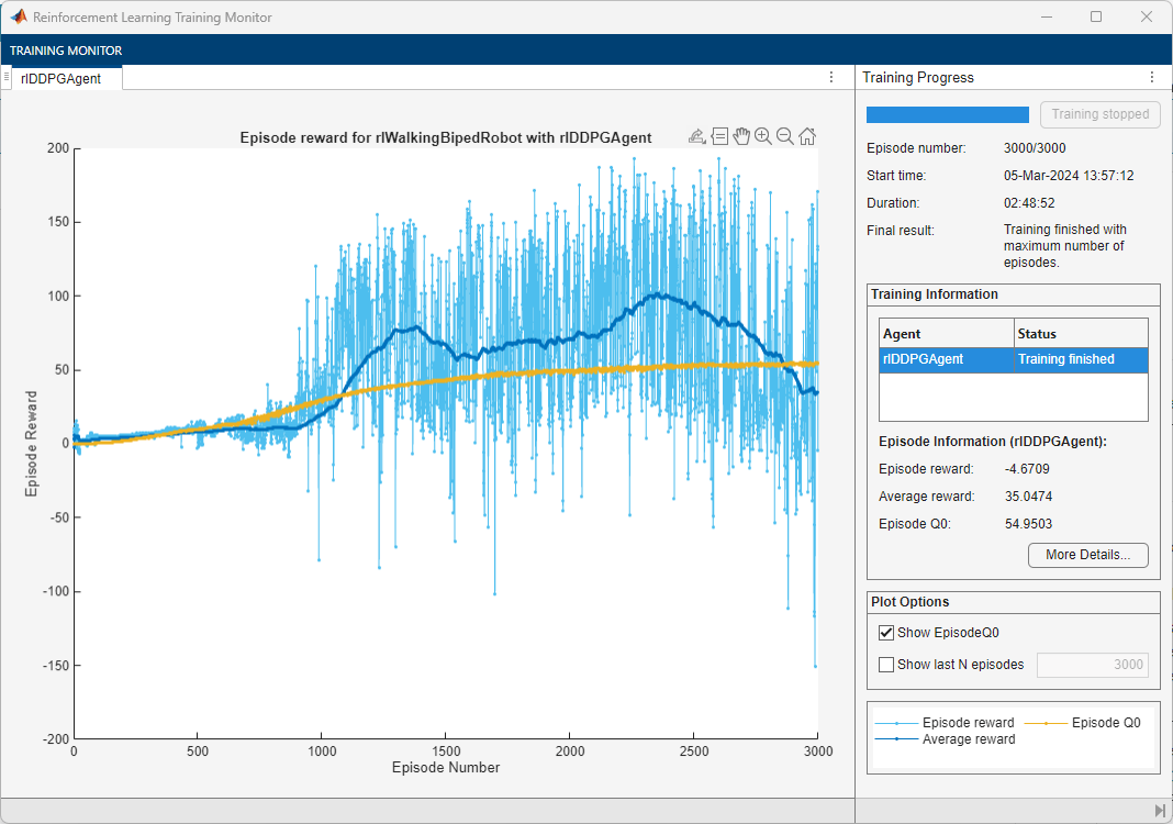 For another example on how to train a humanoid robot to walk using a DDPG agent, see Train Humanoid Walker (Simscape Multibody). For an example on how to train a quadruped robot to walk using a DDPG agent, see Quadruped Robot Locomotion Using DDPG Agent.