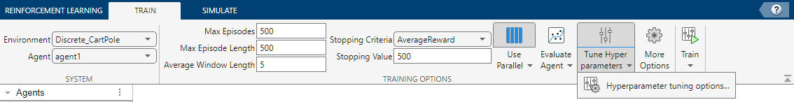 The Reinforcement Learning Designer app automates several steps in these examples. You can tune hyperparameters with default settings or configure the settings before tuning.
