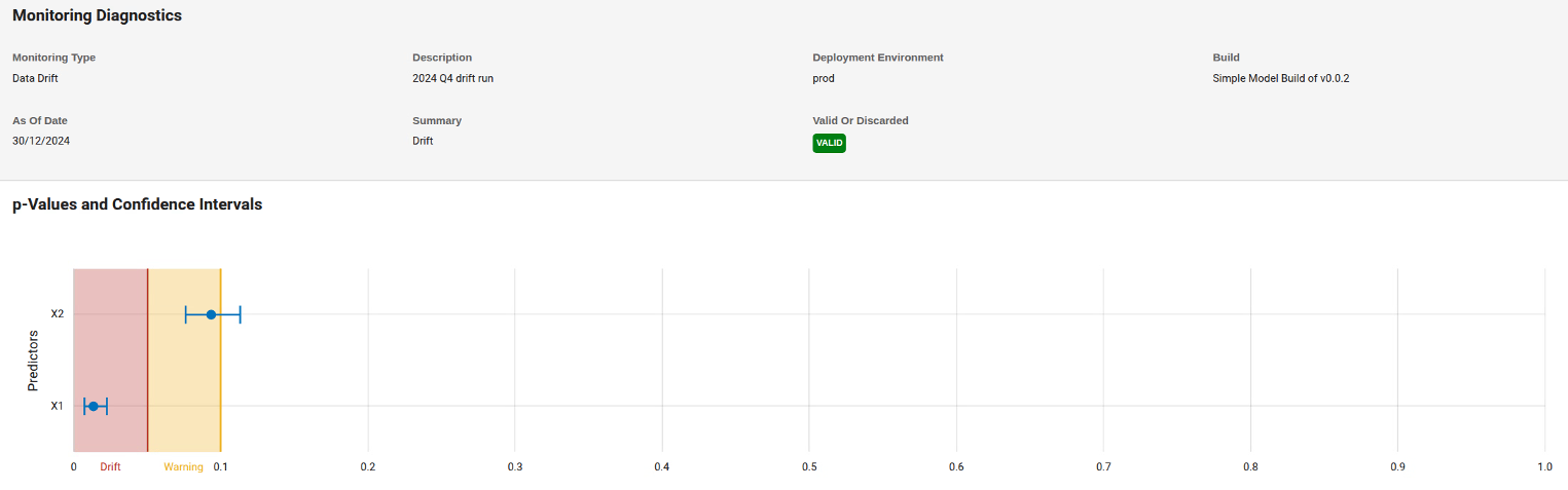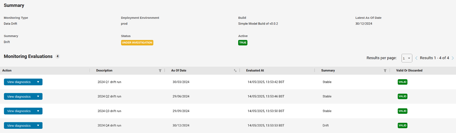 Modelscape supports automated actions to, for example, send an email alert to model owners in informing them of the change in state. To find further information about the data drift monitoring, click View Details. This takes you to the Monitoring Evaluations page.