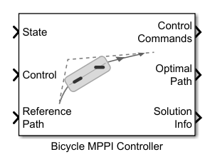 The Bicycle MPPI Controller block enables you to plan a local path for a Bicycle Kinematic Model, following a reference path typically generated by a global path planner such as RRT* or Hybrid A*, using the model predictive path integral (MPPI) algorithm.