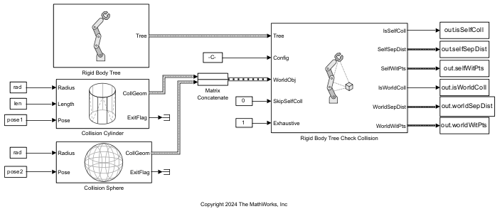 The Rigid Body Tree Check Collision block checks if the specified rigid body tree robot model is in collision with itself or a specified set of collision objects in the world.