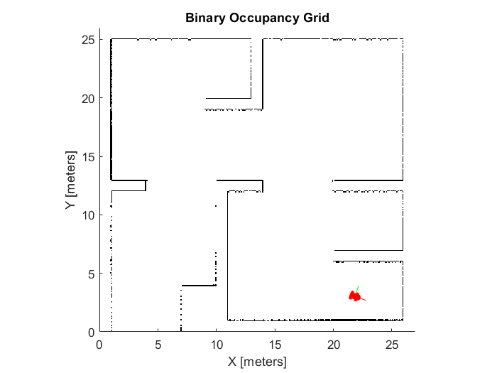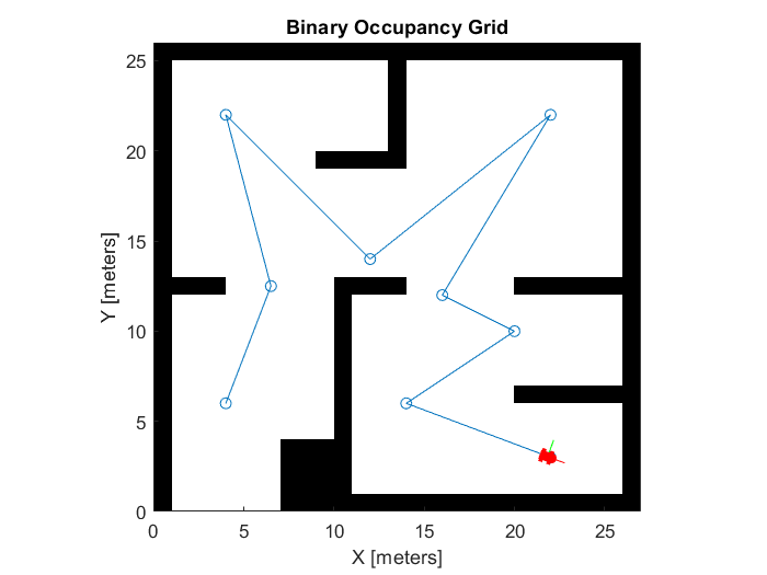 Utilice la función auxiliar exampleHelperDiffDriveCtrl proporcionada. La función auxiliar contiene el bucle principal para desplazarse por la ruta, obtener lecturas de distancia y crear mapas del entorno.