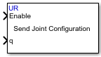 The Send Joint Configuration block commands the UR cobot using the RTDE interface to move to a specified joint configuration for completing a trajectory. The block also allows you to specify additional constraints like end time, velocity or acceleration to complete the motion; else, it uses default values for these constraints.