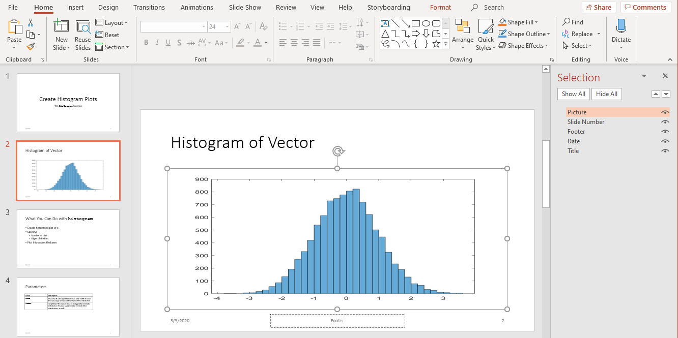 The PowerPoint Normal View with the "Histogram Of Vector" slide selected and the Picture name highlighted in the Selection pane.