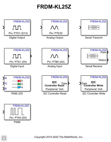 Simulink Coder Support Package for NXP FRDM-KL25Z Board enables you to create and run Simulink models on a NXP FRDM-KL25Z board. The support package includes a library of Simulink blocks for configuring and accessing NXP FRDM-KL25Z peripherals and communication interfaces.