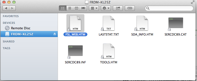 On Mac, It will appear as a removable storage drive with a volume label of FRDM-KL25Z.