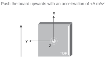 Push the board upward with an acceleration of A m/s2 . The acceleration of the gravity is dynamic and equal to the acceleration of the block minus the force of gravity ≈ (+A-9.81) m/s2 . In the resultant [1x3] vector, the value of the X-axis ranges between the full-scale range value that you specify in the Acceleration full scale range parameter.