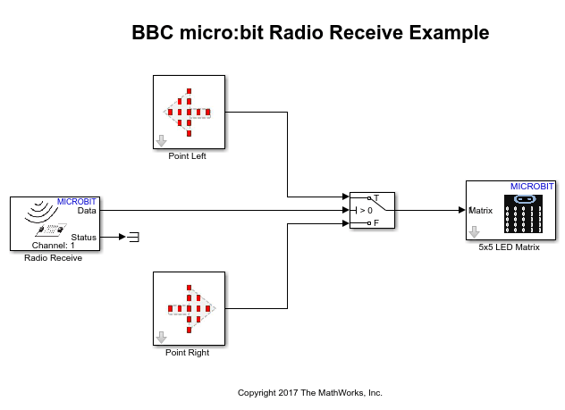 In the bbcmicrobit_radio_receive model, the Radio Receive block receives the data from the transmitting BBC micro:bit. Ensure that the Radio Receive block is configured for the same channel as the Radio Transmit block. Additionally, the Radio Receive block is also configured with Data length set to 1 (for interpreting data of one axis only) and the Data type as double. The 5x5 LED Matrix block is used to display the arrow (Point Left block and Point Right block) based on the output from a Switch block.