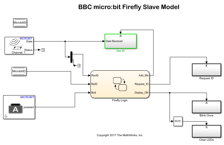 Use the bbcmicrobit_fireFly_Slave model on each of the remaining BBC micro:bits, which flashes an LED when it receives an ID or responds to the broadcast from the Queen BBC micro:bit.
