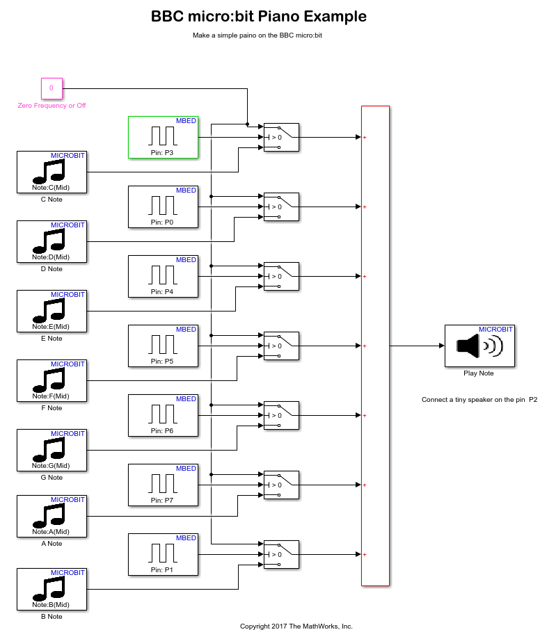The Piano Simulink model maps the pins on the BBC micro:bit to particular notes, and the note is played if you short the pin to the GND (ground) pin.