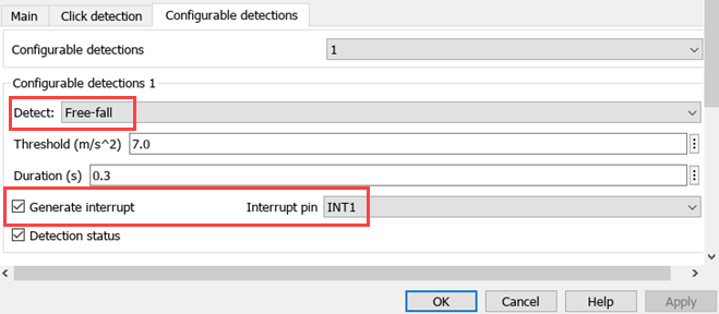 3. Ensure that the Free-fall is selected for Detect parameter and also ensure that Generate Interrupt parameter is selected and INT1 is selected for Interrupt pin.