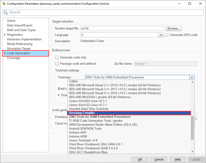 In the Configuration Parameters window, click Code Generation pane. By default, the Toolchain is GNU Tools for ARM Embedded Processors.