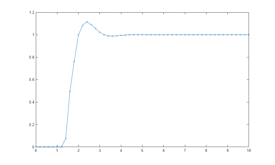 At the start of the execution, the executable invokes the model initialize function. The executable reads the value of VCtrl from the slexVariantParametersStartup_VCtrl.txt file to evaluate the if conditions in the function. Since the value of VCtrl is set to 1 in the slexVariantParametersStartup_VCtrl.txt file, the if condition for VCtrl == 1 evaluates to true. The generated executable is conditionally run for the PID gain parameter values that are associated with VCtrl == 1 and creates a slexVariantParametersStartup.mat MAT-file as an output. The MAT-file contains values for the variables rt_tout and rt_yout, where rt_yout represents the linear step response at the outport block Out1 for each time step rt_tout.