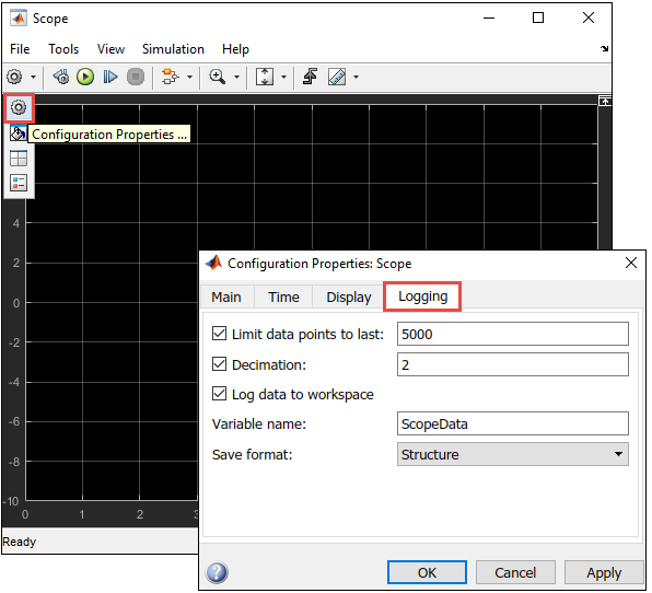 5, the block writes data at every fifth sample. For example, if the block sample time is0.1and Decimation is5, the data points at 0, 0.5, 1, 1.5, ... seconds are logged. The data points are logged until the Stop time (specified in the Modeling tab of the Simulink model window) is reached.Log data to workspace Select this parameter to enable data logging. When you select this parameter, the Variable name and Save format parameters become available.
