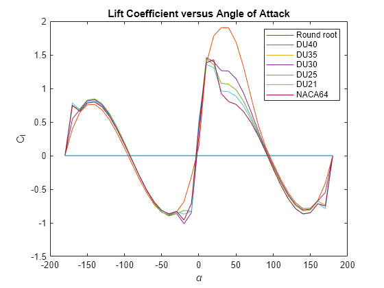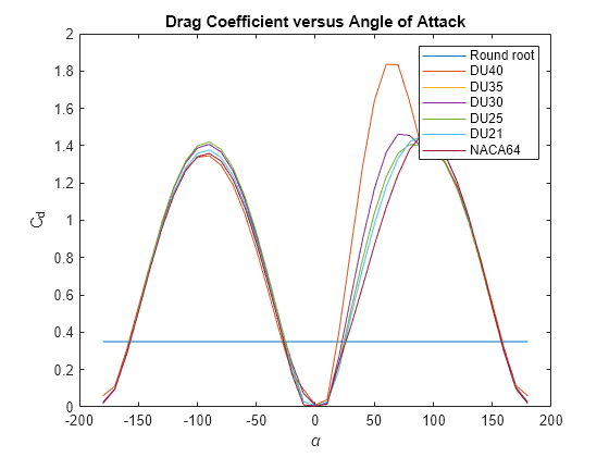 figure; plot(Data.alpha_TLU, Data.Cd_TLU); title('Drag Coefficient versus Angle of Attack') xlabel('\alpha') ylabel('C_d') legend('Round root', 'DU40', 'DU35', 'DU30', 'DU25', 'DU21', 'NACA64')