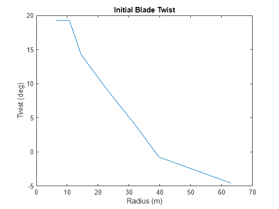 figure; plot(Data.radius_TLU, Opt.Init.twist, Data.radius_TLU, Opt.Final.twist); ylabel('Twist (deg)'); xlabel('Radius (m)'); legend('Initial', 'Optimized') title('Blade Twist');