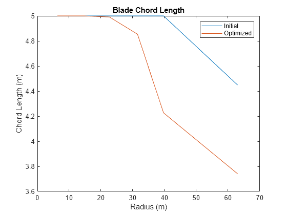 figure; plot(Data.radius_TLU, Opt.Init.chord, Data.radius_TLU, Opt.Final.chord); ylabel('Chord Length (m)'); xlabel('Radius (m)'); legend('Initial', 'Optimized') title('Blade Chord Length');