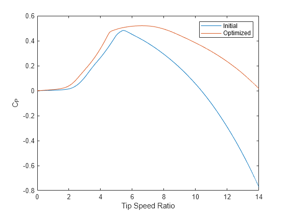 figure; plot(Opt.Init.TSR, Opt.Init.Ct, Opt.Final.TSR, Opt.Final.Ct); xlabel('Tip Speed Ratio') ylabel('C_T') legend('Initial', 'Optimized');