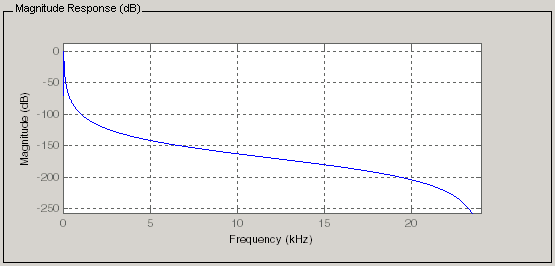 Después de especificar los parámetros de diseño del filtro, haga clic en el botón Design Filter de la parte inferior del panel de diseño para calcular los coeficientes del filtro. La pantalla se actualiza para mostrar la respuesta de magnitud del filtro diseñado.