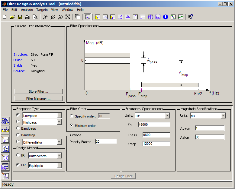 Tenga en cuenta que, cuando abra la app, Design Filter no estará habilitado. Debe hacer un cambio en el diseño del filtro predeterminado para habilitar Design Filter. Esto es así cada vez que se quiere cambiar el diseño del filtro. Los cambios en los elementos de los botones de opción o de los menús desplegables, como los que se encuentran en Response Type o Filter Order, habilitan Design Filter inmediatamente. Los cambios en las especificaciones de los cuadros de texto como Fs, Fpass y Fstop requieren que se haga clic fuera del cuadro de texto para habilitar Design Filter.