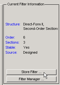 Tenga en cuenta que el botón Design Filter se deshabilita después de calcular los coeficientes de su diseño del filtro. Este botón se habilita de nuevo si realiza algún cambio en las especificaciones del filtro.