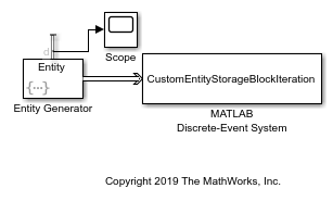 This example shows how to implement a discrete-event System Object™ which represents a custom entity storage block with an iteration event. The model also includes an Entity Generator block that generates Wheels with various Diameter values.