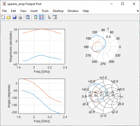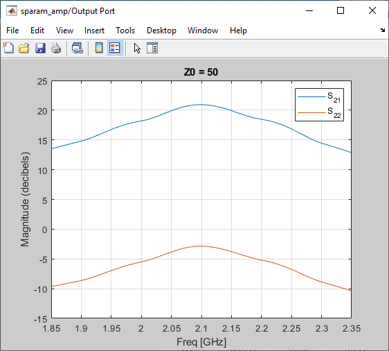 Double-click the Output Port block to open the block mask. Select the Visualization tab and set the Y Parameter1 to S22. Click Plot to add S22 to the S21 plot.