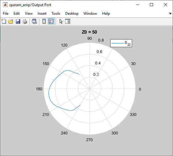 Double-click the Output Port block to open the block mask. Select the Visualization tab and set Plot type to Polar plane. Click Plot to create a Polar plane plot of S22 as a function of frequency.