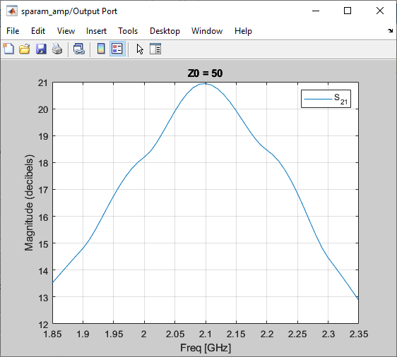 In this part of the example, you open and run a RF Blockset™ equivalent baseband example that uses data file to specify an amplifier in a physical subsystem. Then, you plot the network parameters of the physical subsystem, which consists of the General Amplifier, the Input Port, and the Output Port blocks.