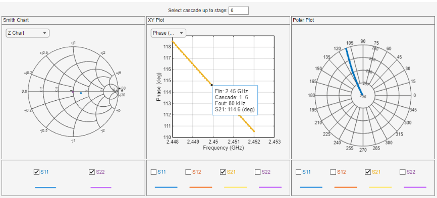 The implemented phase shift of 115 degrees has been determined by inspecting the phase rotation in the budget analysis. Run this command at the command line to open the RF Budget Analyzer app. Select the S-parameters plot button to plot the S-parameters plot. Enter 6 in Select cascade up to stage and observe the polar plot to see the phase shift of 115 degrees.
