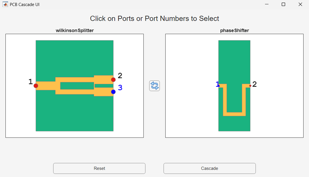 Connect the port 3 of the Wilkinson splitter with port 1 of the phase shifter using the pcbcascade object interactively.