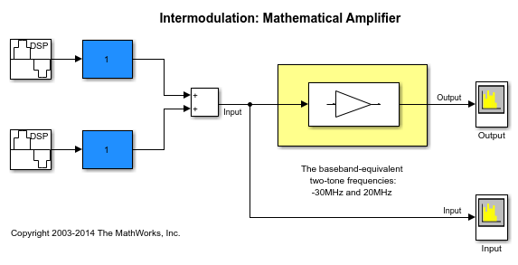 To view the intermodulation performance at the output, double click the Slider Gain blocks and change the gain while the model is running.