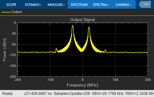 The Output scope block shows the output spectrum of the two-tone input signal when the input signal passes through the Amplifier block, with the Method parameter set to Hyperbolic tangent. The example uses the default Amplifier block IIP3 (dBm) value of 30. It uses no AM/PM conversion. The example specifies thermal noise as Noise figure, for which it uses the default 3.01 dB.