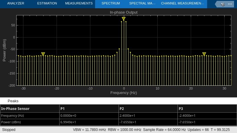 • The In-Phase Output plot shows the power spectrum of the in-phase signal at baseband. In the figure, DC power is a direct result of the blocker and the IP2 in the mixers.