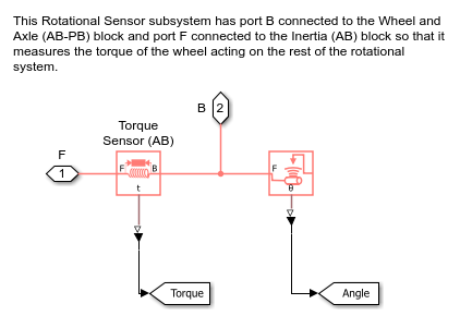 The Torque Sensor is connected between the Wheel and Axle rotational port and the Inertia block. It measures the torque applied by the ground on the rest of the rotational network. Port B of the Torque Sensor is connected to the Wheel and Axle and port F of the sensor is connected to the rest of the rotational network so that the sensor measures the torque applied by the wheel on the rest of the rotational network. For more information on measuring torque, see the Interpreting Torque in the Angle-Based Rotational Domain example.